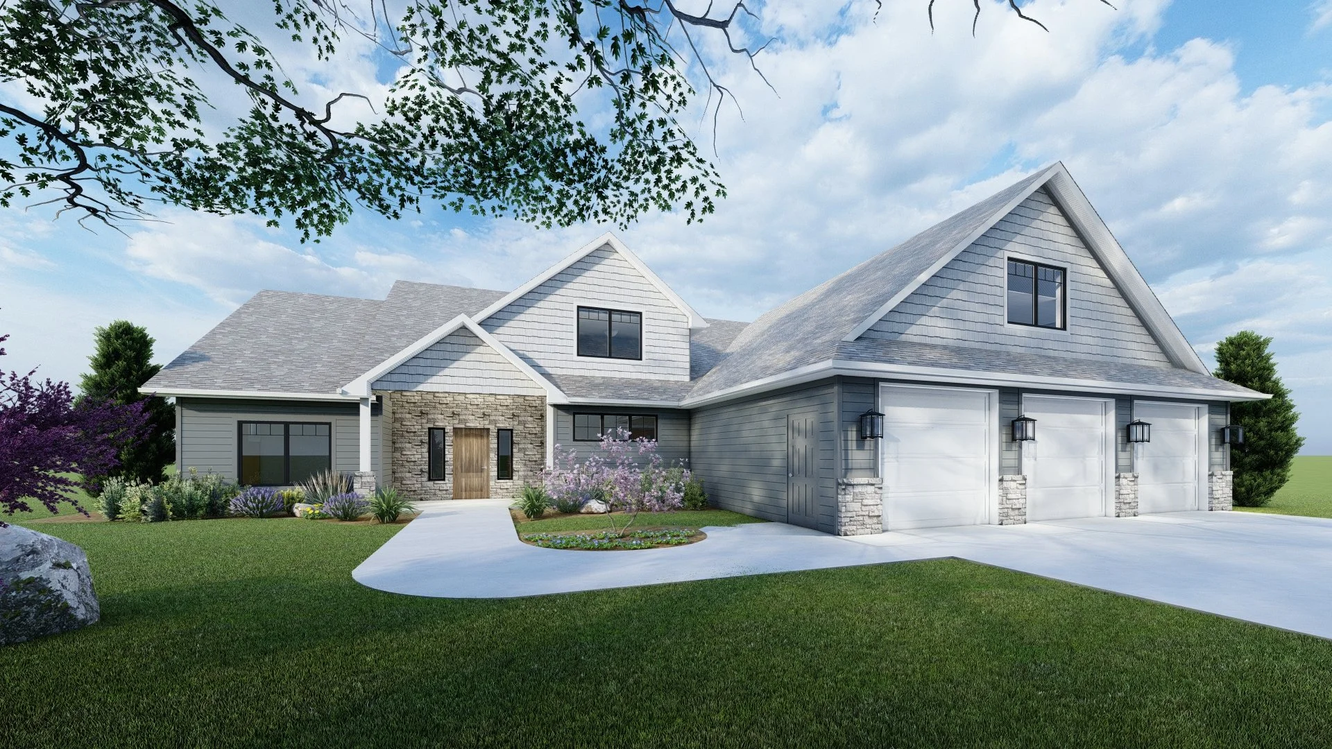 The Maple floor plan offers comfortable main-level living with thoughtful design throughout. The main floor features an open living room, dining area, and kitchen with a large island and pantry, along with a private primary suite, additional bedroom, bathroom, laundry, and mudroom. A spacious attached garage and a finished lower level provide additional bedrooms, a bathroom, and a large family room for extra living space.